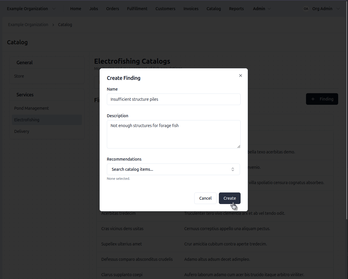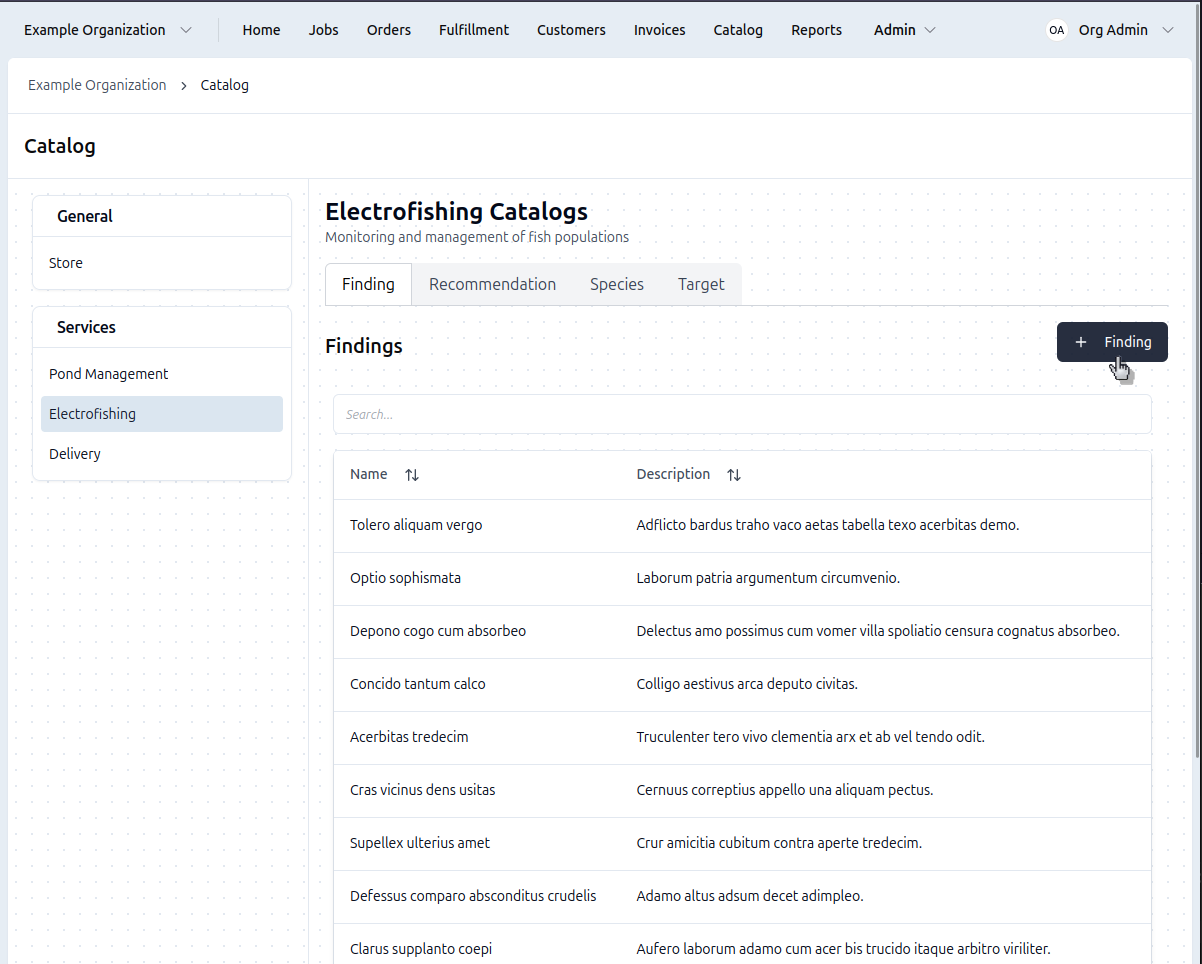 Access the catalog: Click Catalog in the top navigation bar → Select the Electrofishing catalog → click the Findings tab