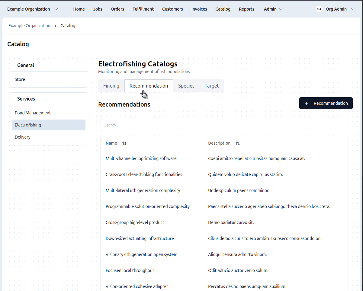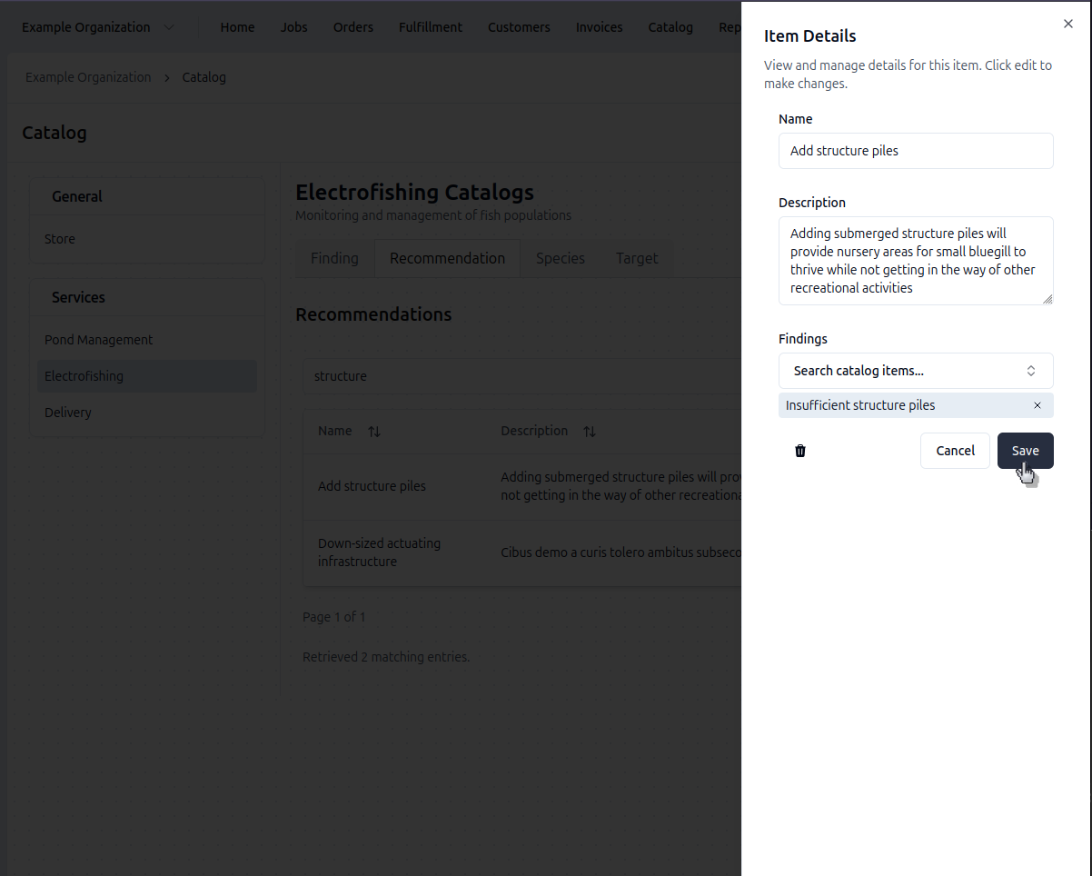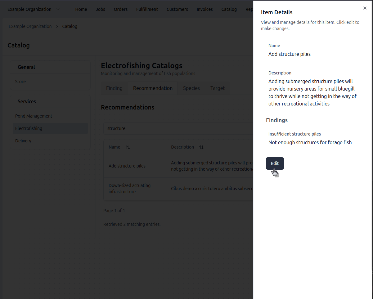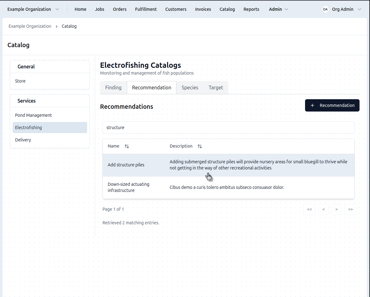 Recommendations are what you advise your clients to do (e.g., "Add Structure Piles"). The recommendations are often included in electrofishing reports, meaning they're what the client sees.